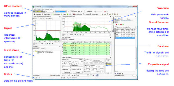 Task ‘Scan range’: scanning of a specified frequency range with operator-determined step and modulation, saving signals in the DB. Programmable conditions of continuation and automatic recording of sound |